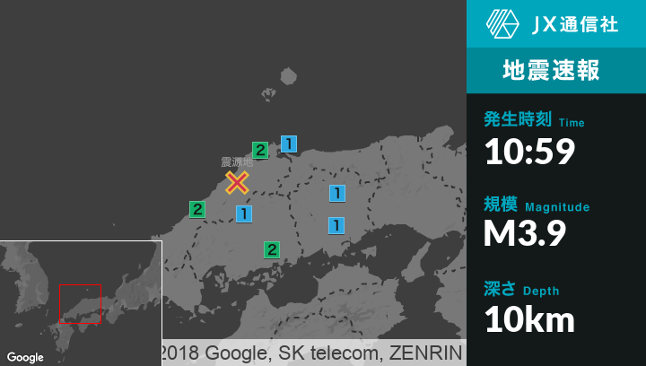 | 震度2 | 出雲市, 雲南市, 大田市, 神石高原町 |
