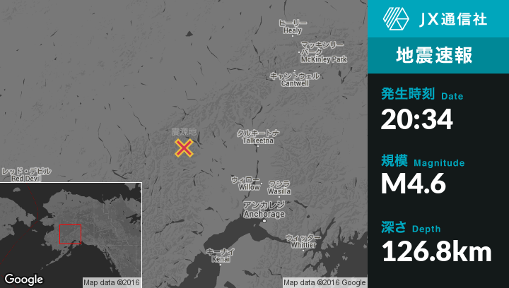 | 震源地 | アラスカのTalkeetnaから西123kmの地点 |