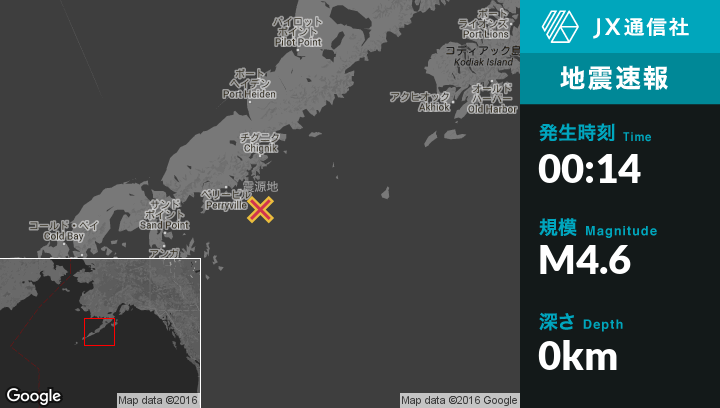 8月28日 00:14頃、アラスカのChignik Lakeから南南東65kmの地点でM4.6の地震がありました。