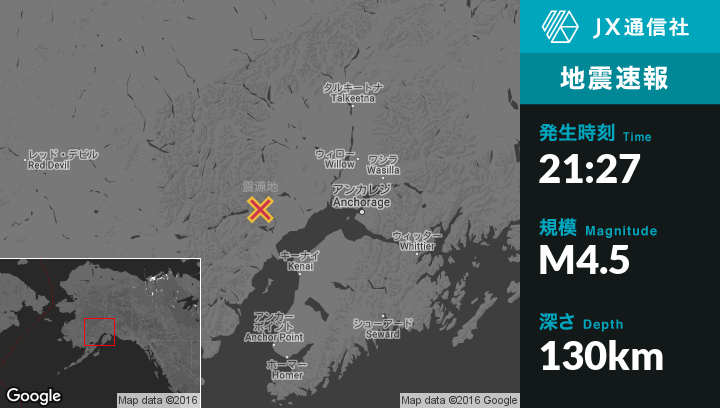 9月01日 21:27頃、アラスカのNikiskiから北北西81kmの地点でM4.5の地震がありました。