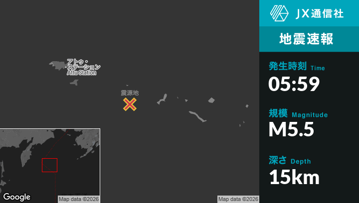 3月25日 05:59頃、アラスカのAttu Stationから東南東219kmの地点でM5.5の地震がありました。