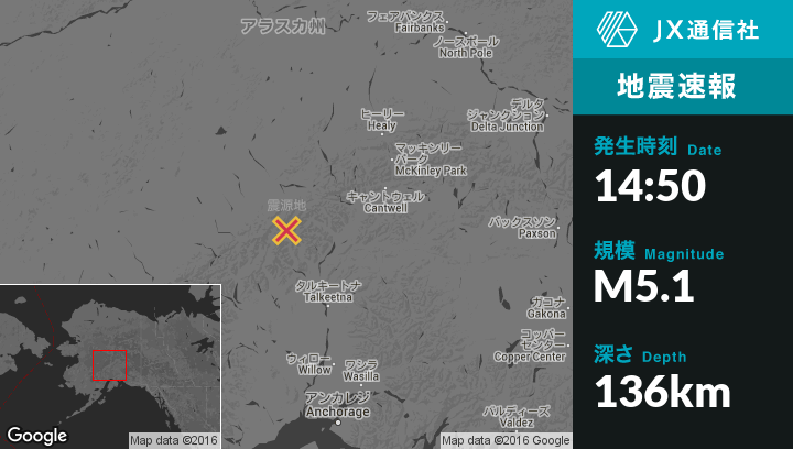 5月15日 14:50頃、アラスカのTalkeetnaから北北西92kmの地点で地震がありました。