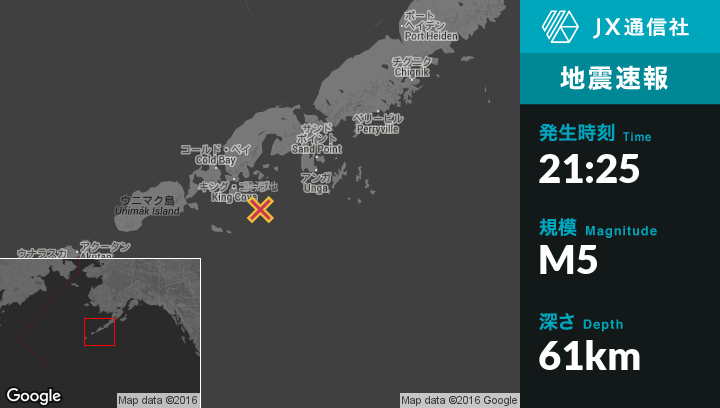 | 震源地 | アラスカのCold Bayから南東78kmの地点 |