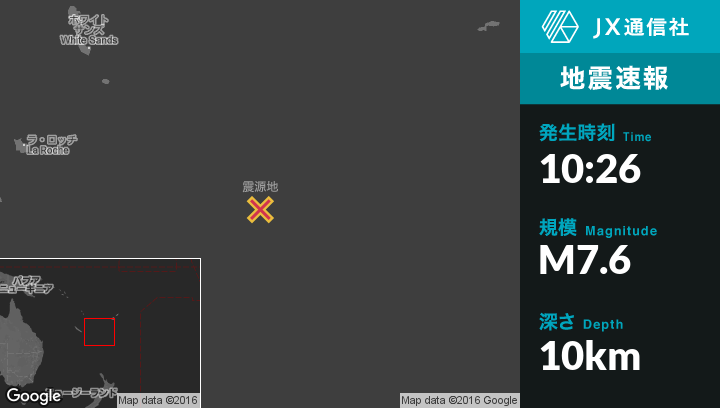 | 震源地 | ニューカレドニアのIle Hunterから東南東122kmの地点 |