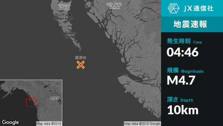 9月17日 04:46頃、カナダのBella Bellaから西南西217kmの地点でM4.7の地震がありました。