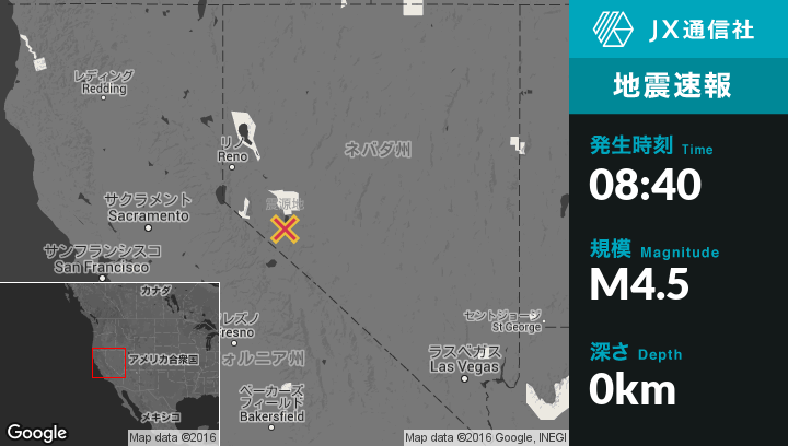 | 震源地 | ネバダ州のHawthorneから北西19kmの地点 |