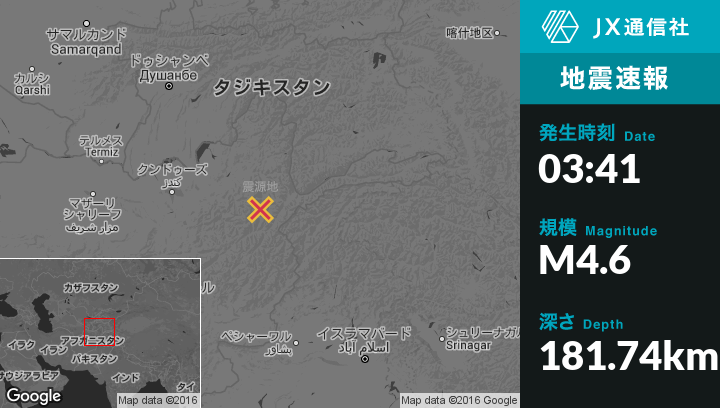 5月16日 03:41頃、アフガニスタンのJarmから南39kmの地点で地震がありました。