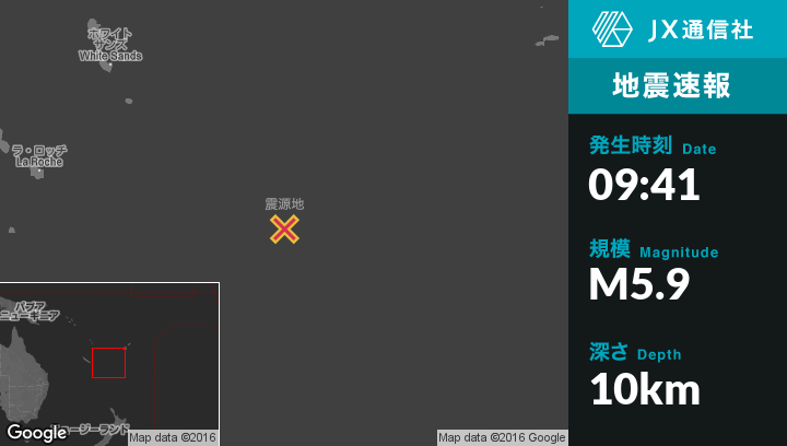 5月16日 09:41頃、ニューカレドニアのIle Hunterから東92kmの地点で地震がありました。
