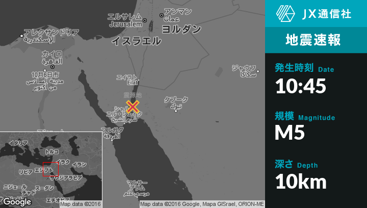 5月16日 10:45頃、エジプトのDhahabから北東25kmの地点で地震がありました。