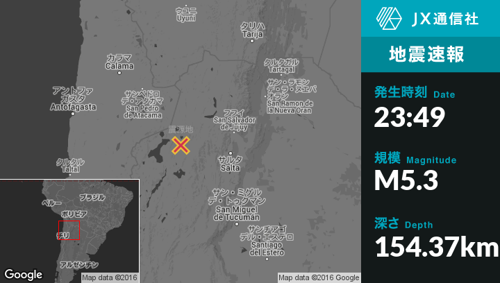 | 震源地 | アルゼンチンのSan Antonio de los Cobresから西南西71kmの地点 |