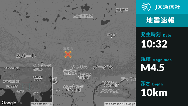 5月22日 10:32頃、中国のGyangkarから西北西30kmの地点で地震がありました。