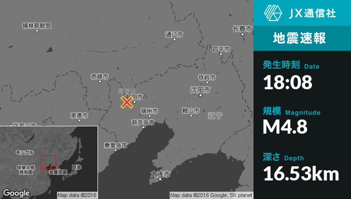 5月22日 18:08頃、中国のChaoyangから西北西30kmの地点で地震がありました。