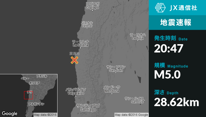 5月22日 20:47頃、チリのOvalleから西50kmの地点で地震がありました。