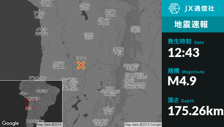 | 震源地 | チリのSan Pedro de Atacamaから北東131kmの地点 |