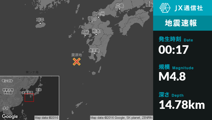 5月24日 00:17頃、日本のMakurazakiから西102kmの地点で地震がありました。