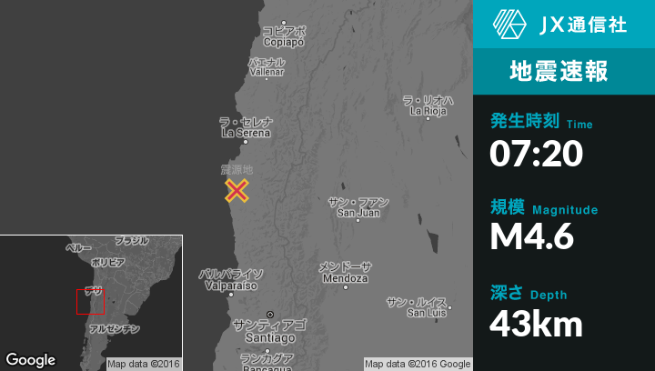 7月02日 07:20頃、チリのOvalleから南西35kmの地点で地震がありました。
