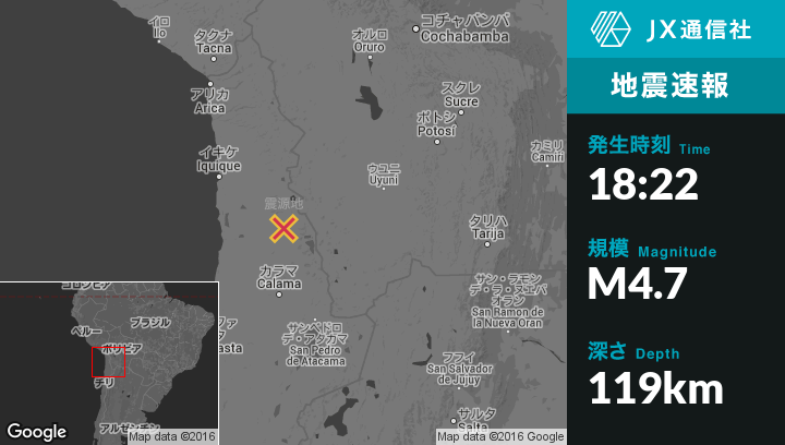 7月03日 18:22頃、チリのCalamaから北152kmの地点で地震がありました。
