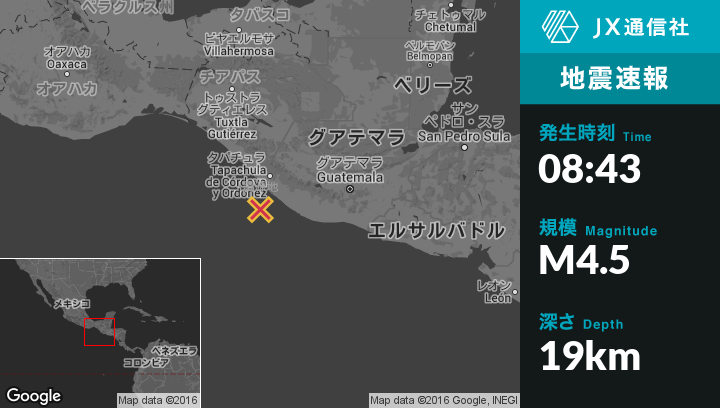 7月04日 08:43頃、グアテマラのOcosから南西38kmの地点で地震がありました。