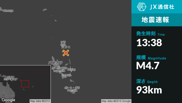 7月04日 13:38頃、バヌアツのSolaから南南東50kmの地点で地震がありました。