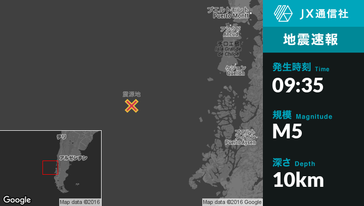 | 震源地 | チリのPuerto Quellonから西南西387kmの地点 |