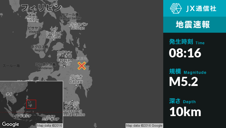 7月09日 08:16頃、フィリピンのAuroraから北6kmの地点で地震がありました。