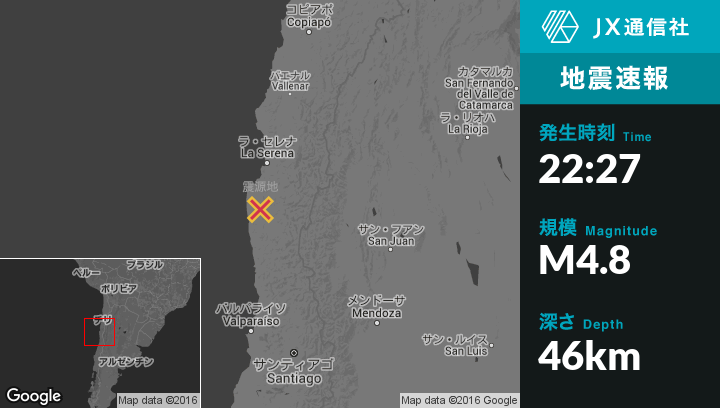 7月11日 22:27頃、チリのOvalleから西南西23kmの地点で地震がありました。