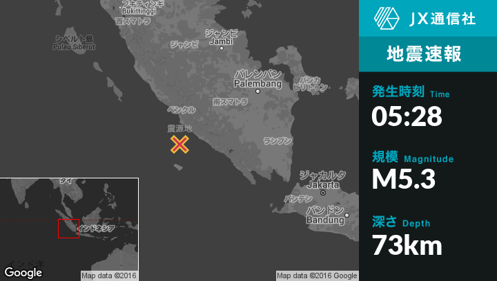 | 震源地 | インドネシアのBengkuluから南83kmの地点 |