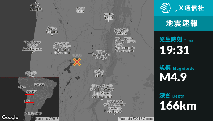 | 震源地 | アルゼンチンのSan Antonio de los Cobresから西78kmの地点 |