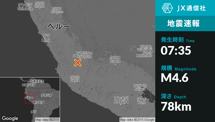 | 震源地 | ペルーのAyacuchoから西南西56kmの地点 |