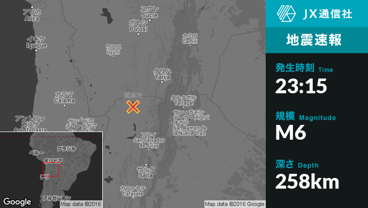 | 震源地 | アルゼンチンのAbra Pampaから北西48kmの地点 |