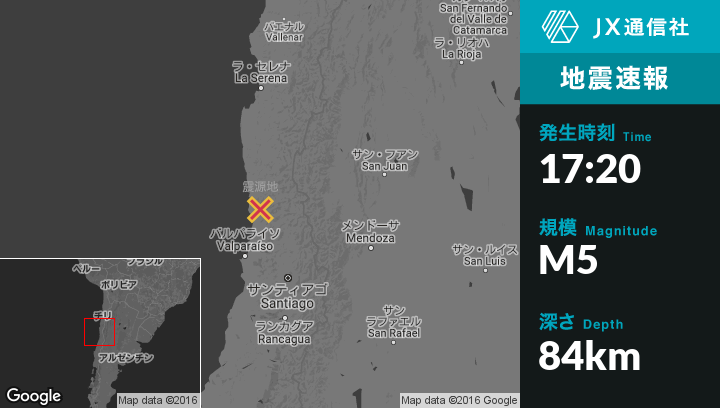 8月10日 17:20頃、チリのLa Liguaから北41kmの地点で地震がありました。
