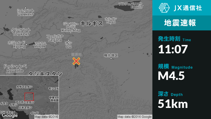 震源地キルギスのSary-Tashから南南東38kmの地点