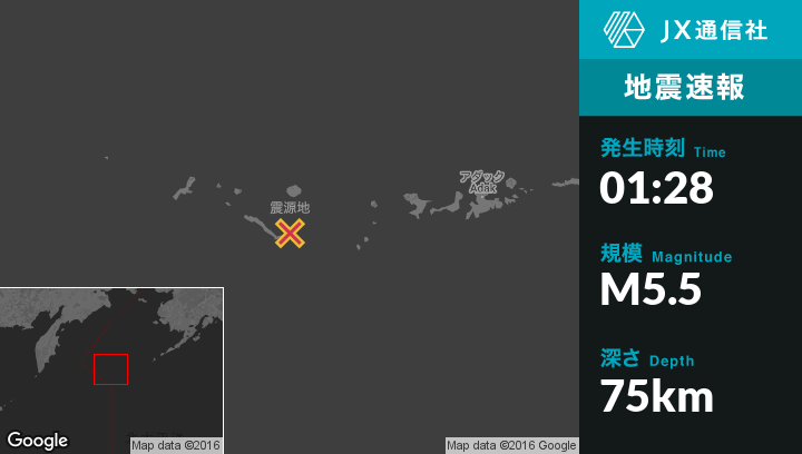 8月15日 01:28頃、アラスカのSemisopochnoi Islandから南49kmの地点で地震がありました。