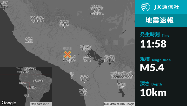 8月15日 11:58頃、ペルーのChivayから西北西7kmの地点で地震がありました。