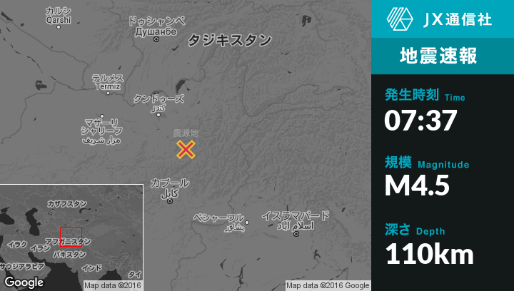 8月24日 07:37頃、アフガニスタンのNahrinから東南東51kmの地点で地震がありました。