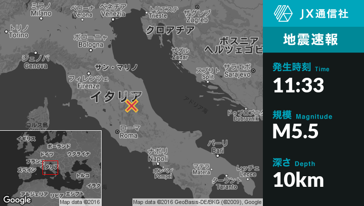 8月24日 11:33頃、イタリアのNorciaから北東4kmの地点で地震がありました。