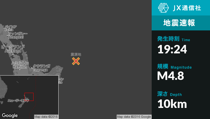 9月02日 19:24頃、ニュージーランドのGisborneから北東210kmの地点でM4.8の地震がありました。