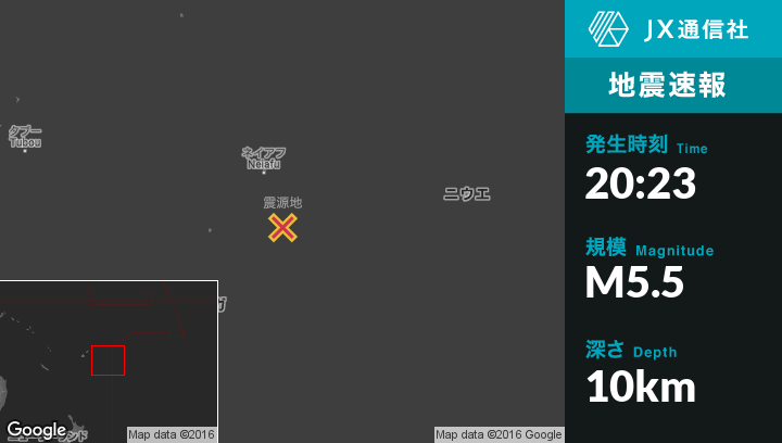 9月02日 20:23頃、トンガのPangaiから東北東80kmの地点でM5.5の地震がありました。