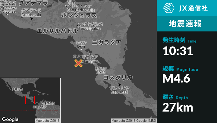 9月04日 10:31頃、ニカラグアのMasachapaから西南西66kmの地点でM4.6の地震がありました。