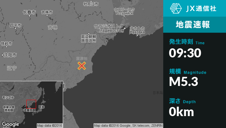 9月09日 09:30頃、北朝鮮のSungjibaegamから東北東18kmの地点でM5.3の地震がありました。