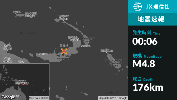 9月11日 00:06頃、パプア ニューギニア独立国のKimbeから東北東87kmの地点でM4.8の地震がありました。