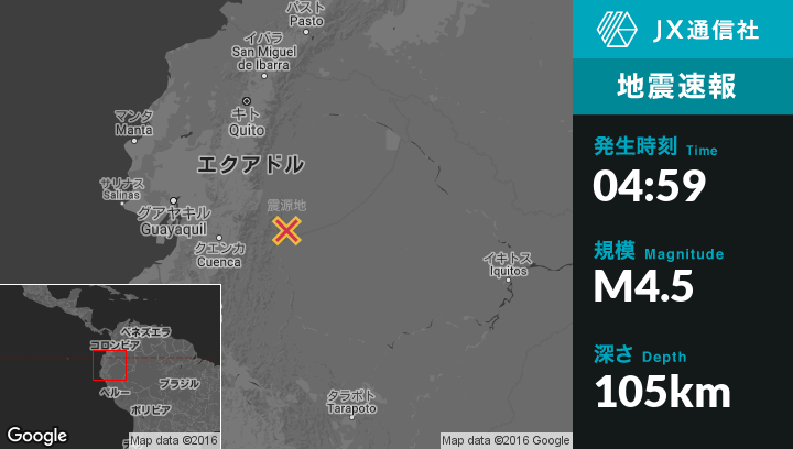 9月12日 04:59頃、エクアドルのSucuaから東南東59kmの地点でM4.5の地震がありました。