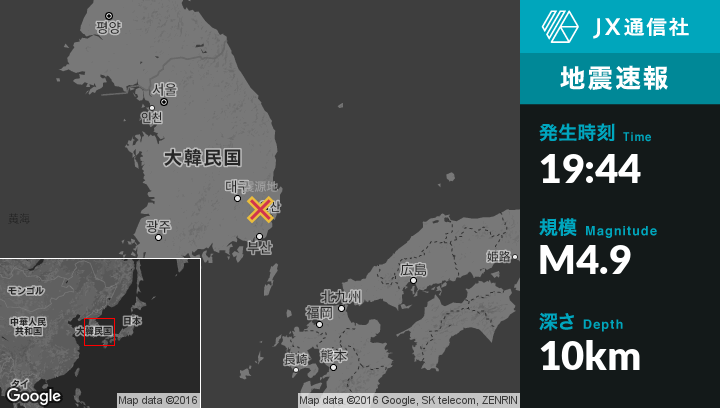 9月12日 19:44頃、韓国のKyonjuから南西14kmの地点でM4.9の地震がありました。