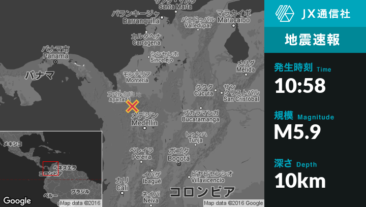 9月14日 10:58頃、コロンビアのMutataから東北東38kmの地点でM5.9の地震がありました。