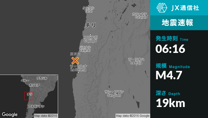 9月15日 06:16頃、チリのVallenarから西南西87kmの地点でM4.7の地震がありました。