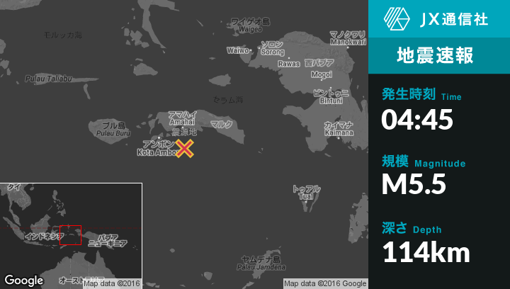 9月16日 04:45頃、インドネシアのSaparuaから南東49kmの地点でM5.5の地震がありました。