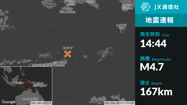 9月16日 14:44頃、東ティモールのDiliから東北東311kmの地点でM4.7の地震がありました。