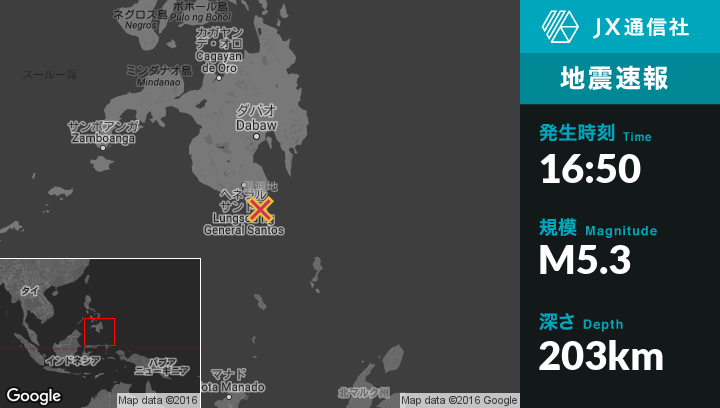 9月16日 16:50頃、フィリピンのKalbayから東南東3kmの地点でM5.3の地震がありました。