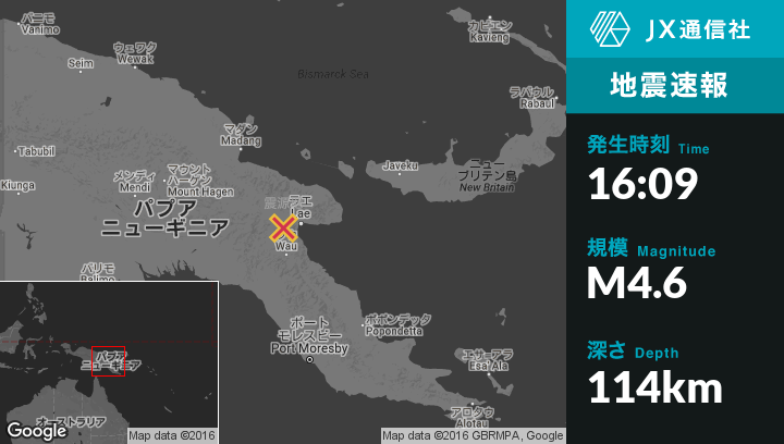 9月17日 16:09頃、パプア ニューギニア独立国のLaeから西38kmの地点でM4.6の地震がありました。