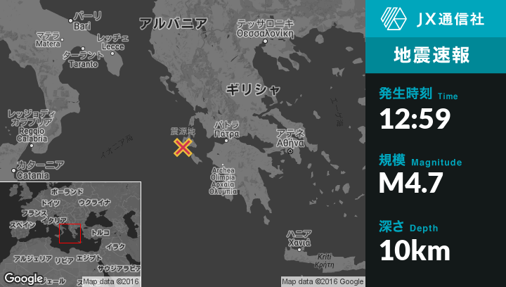 9月19日 12:59頃、ギリシャのLixourionから西南西6kmの地点でM4.7の地震がありました。